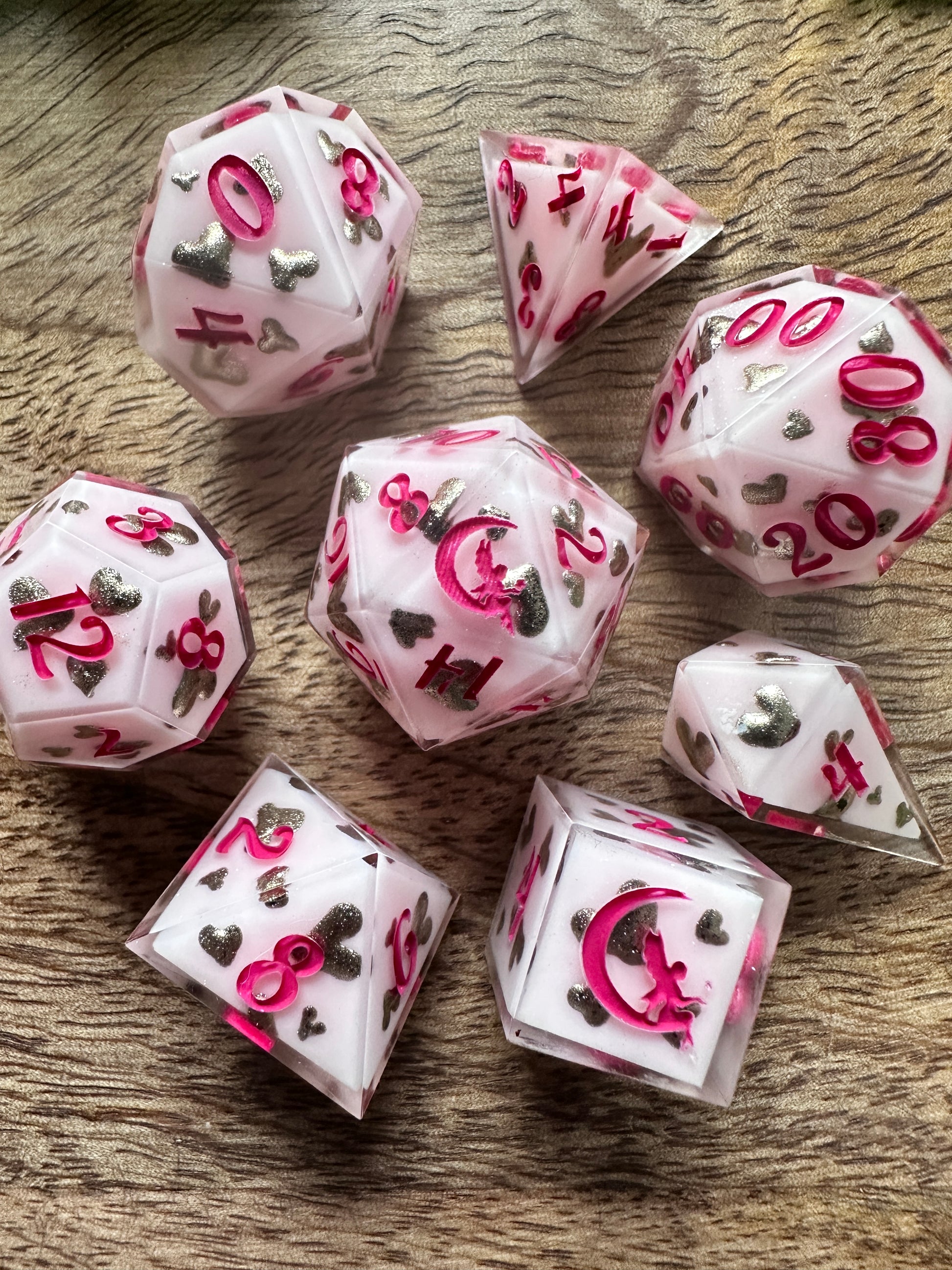 This dice set features an opaque pastel pink base, hand-decorated with gold-chrome hearts, and finished with hot pink ink for the numbers.