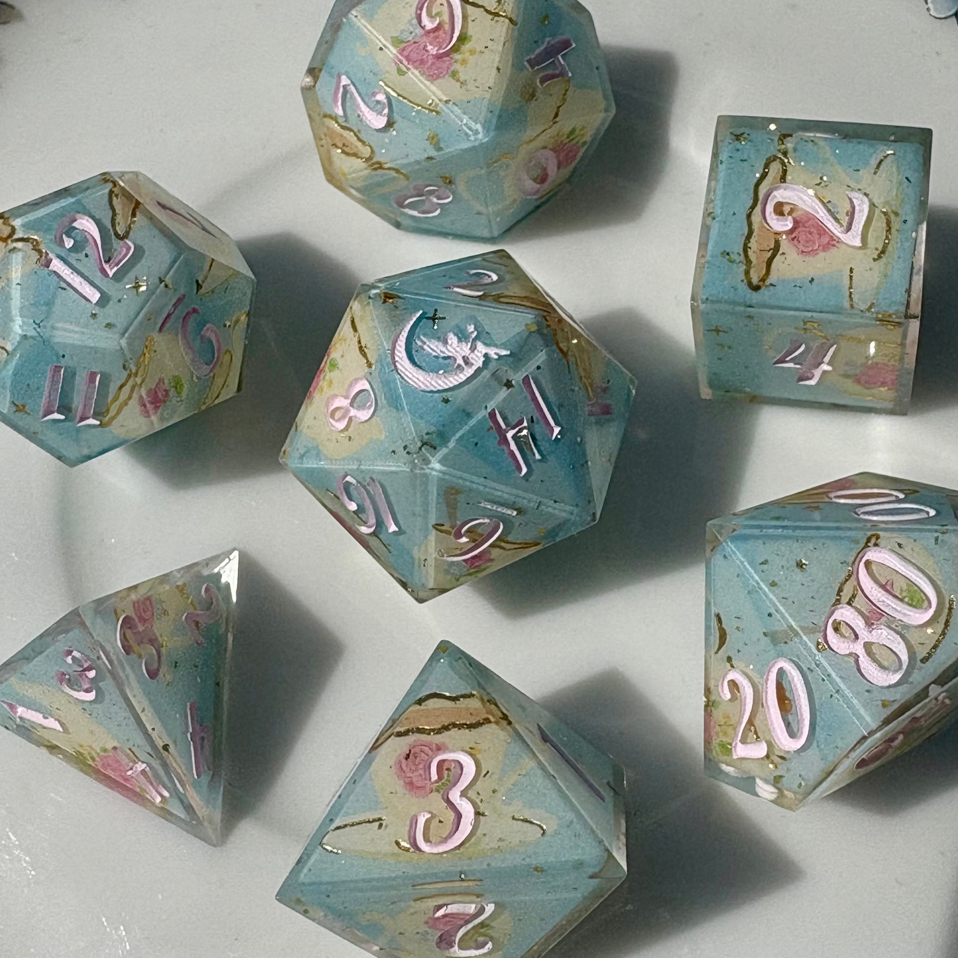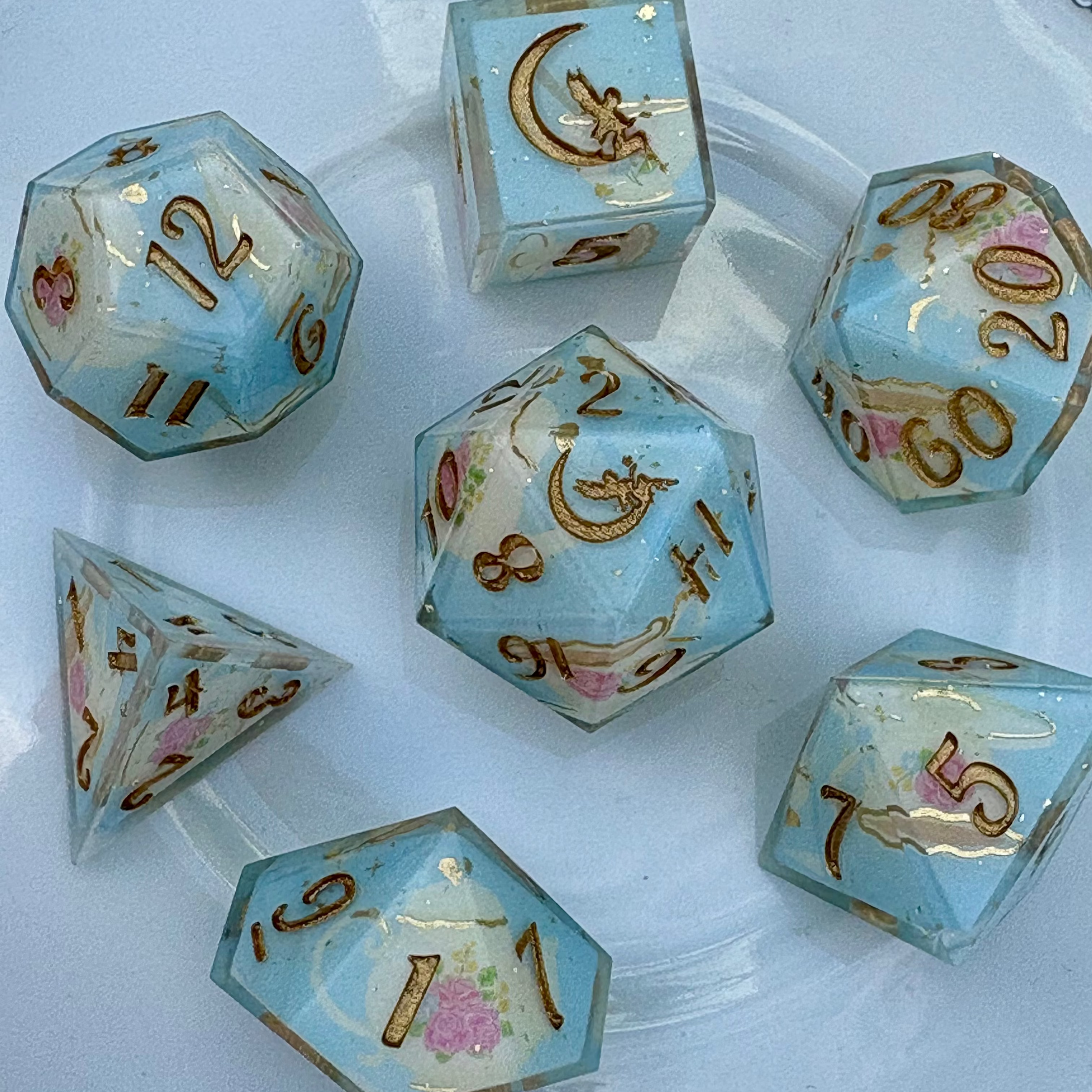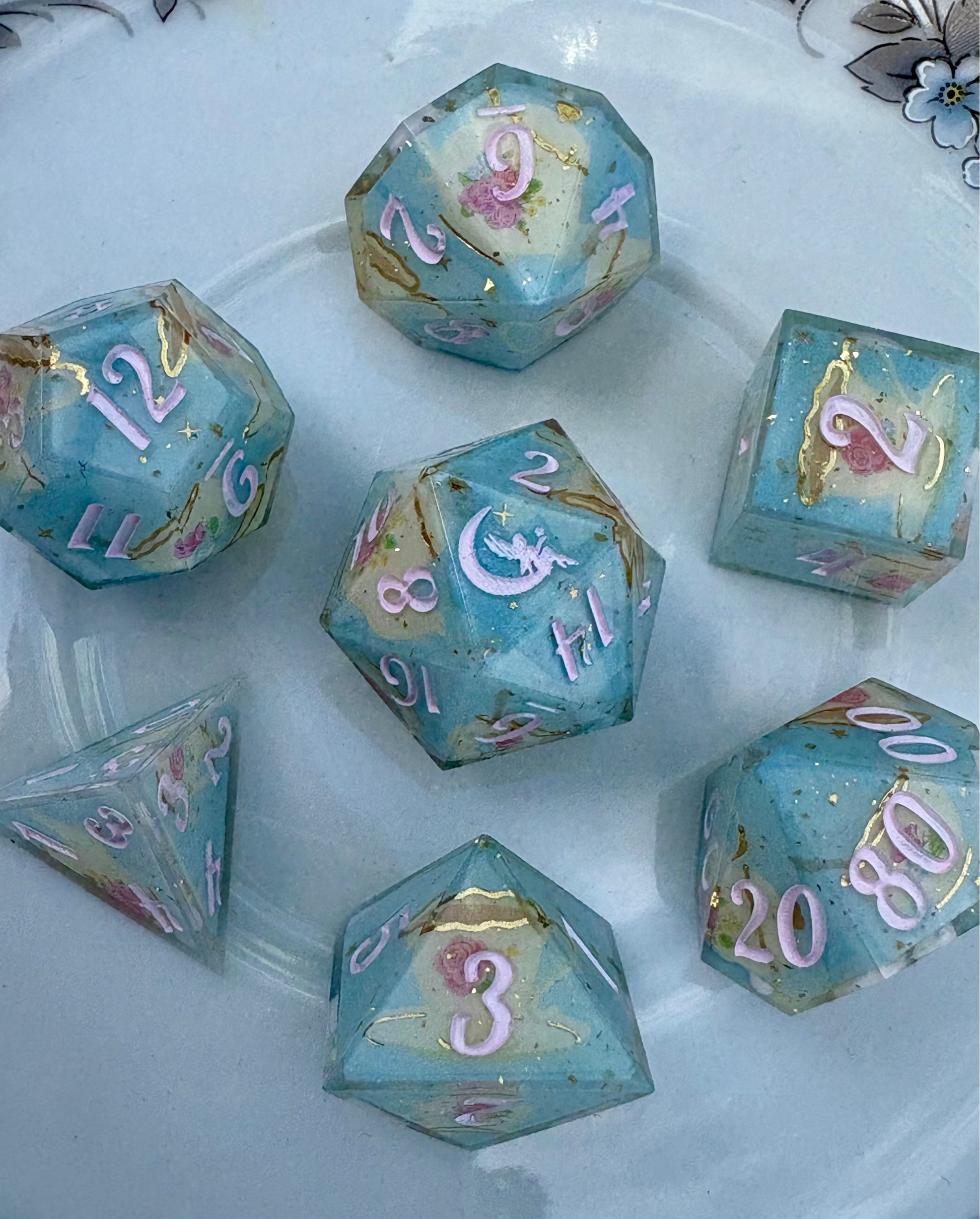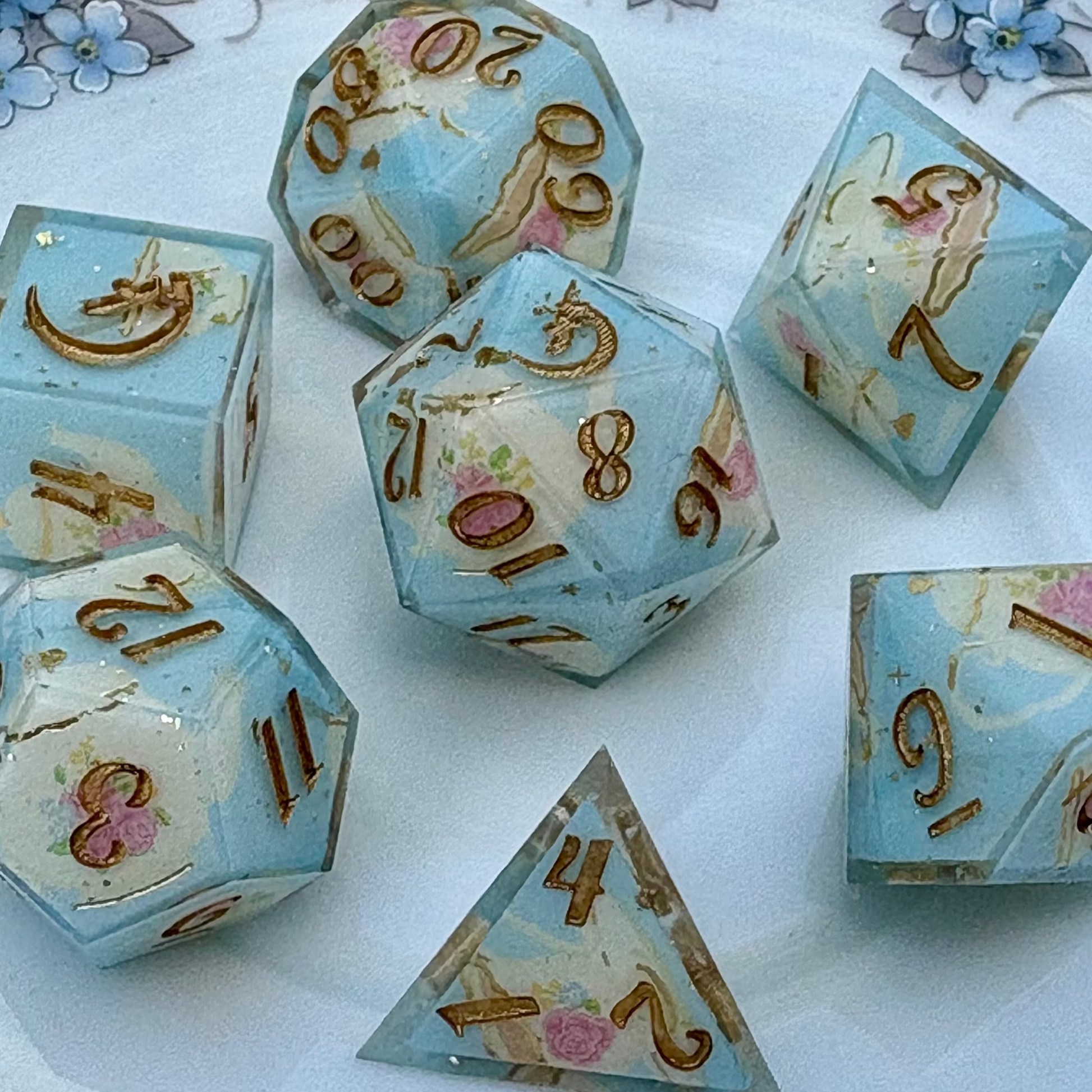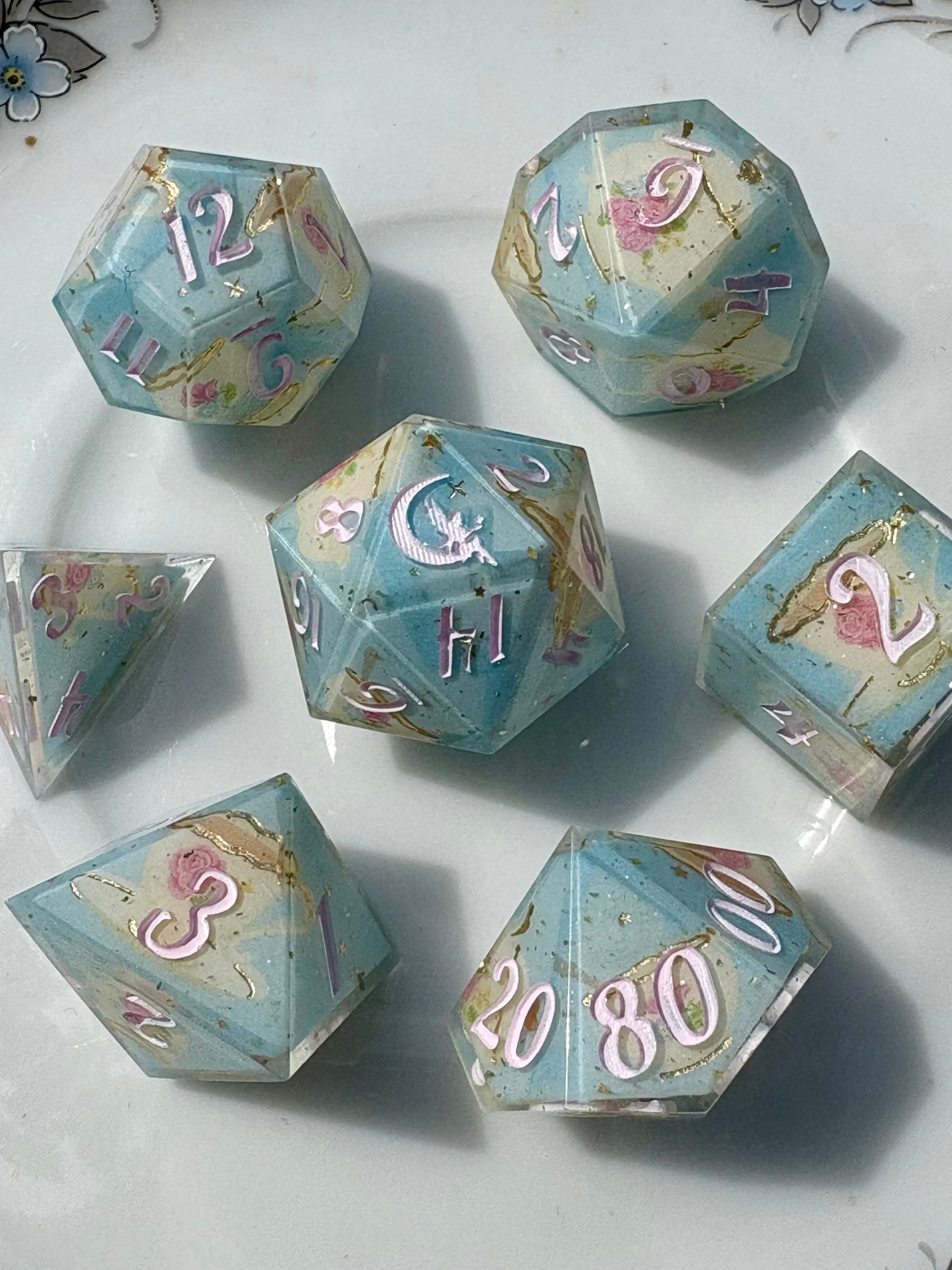 With inspiration from a regency tea parlor, this dice set features a pale blue background, gold stars, a porcelain tea set washi tape, and tiny gold flakes.