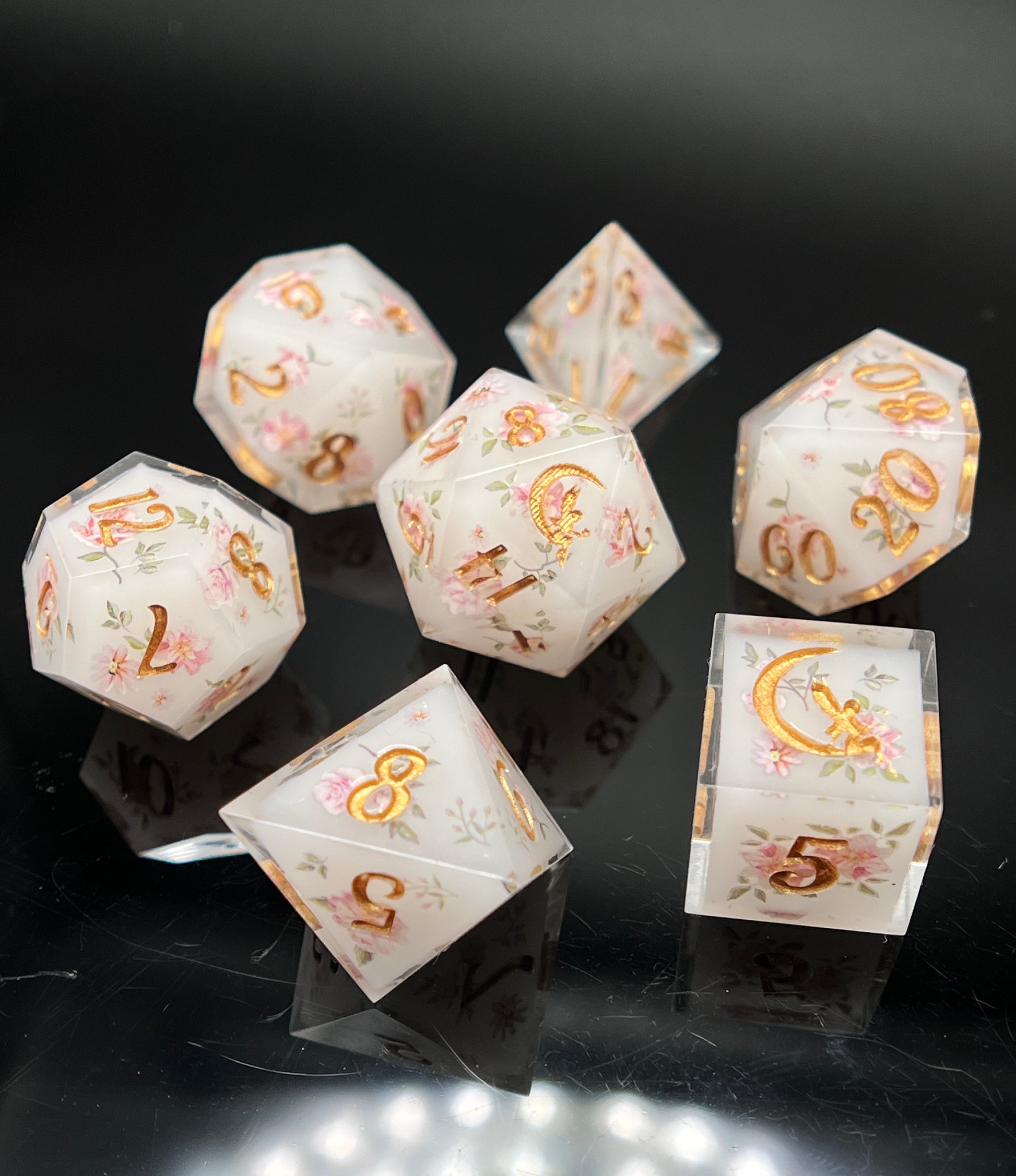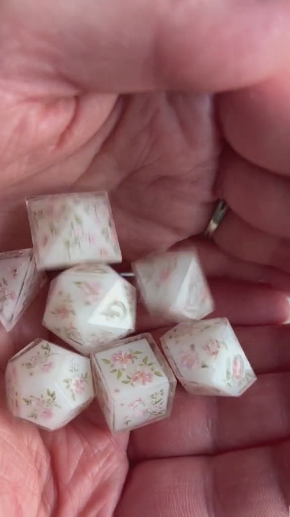 With inspiration from the regency era, tea time, and romantic rose gardens, this simple and refined dice set features delicate pink roses on a crisp white background.