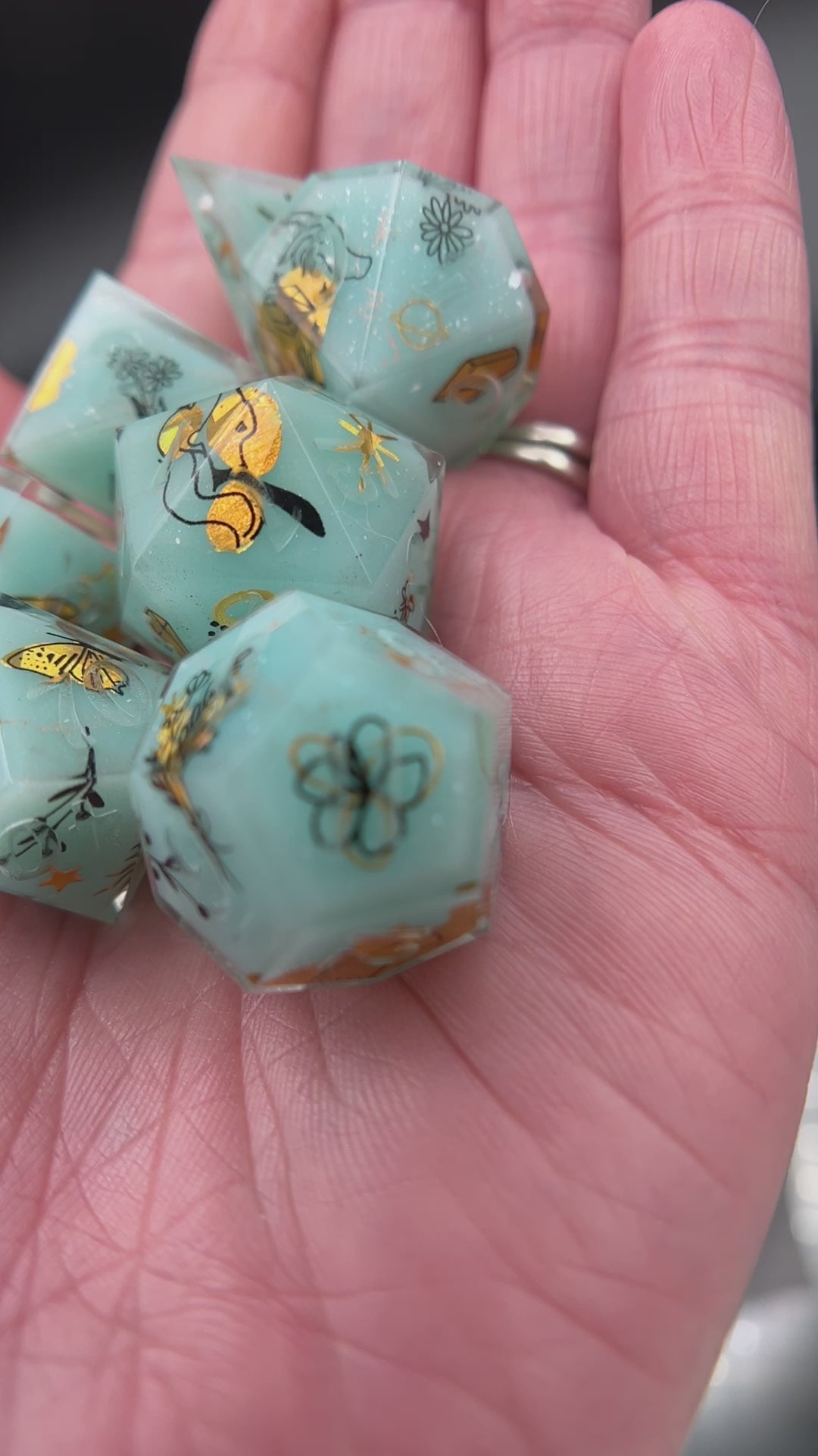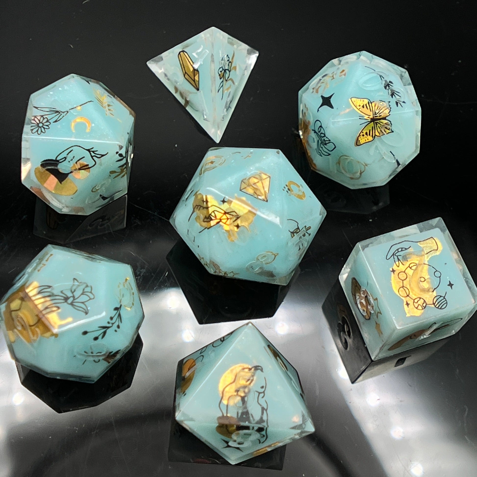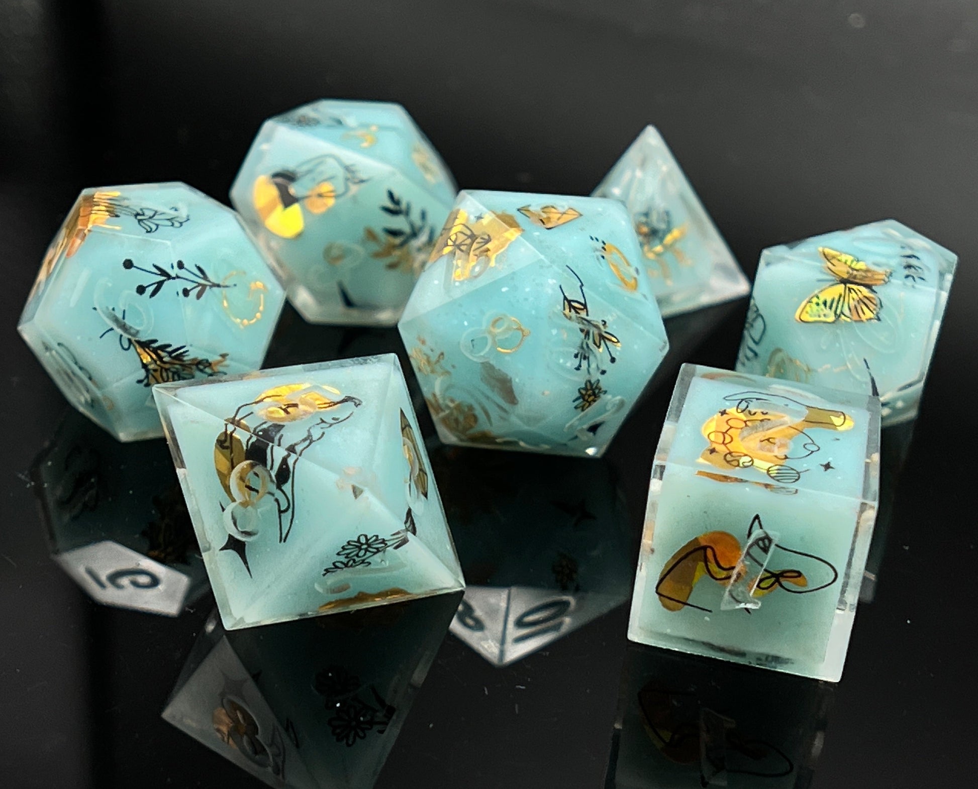 This witchy-vibes set comes in our Fey dice style, meaning it has a whimsical font and the fairy sitting on a crescent moon icon on the D20 and D6.