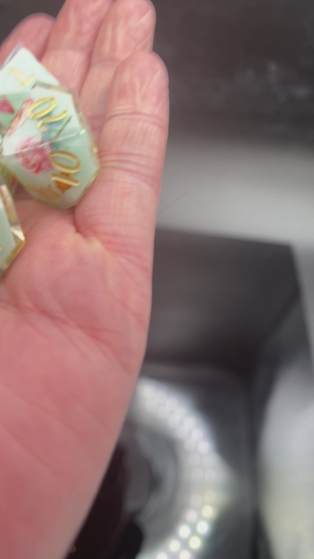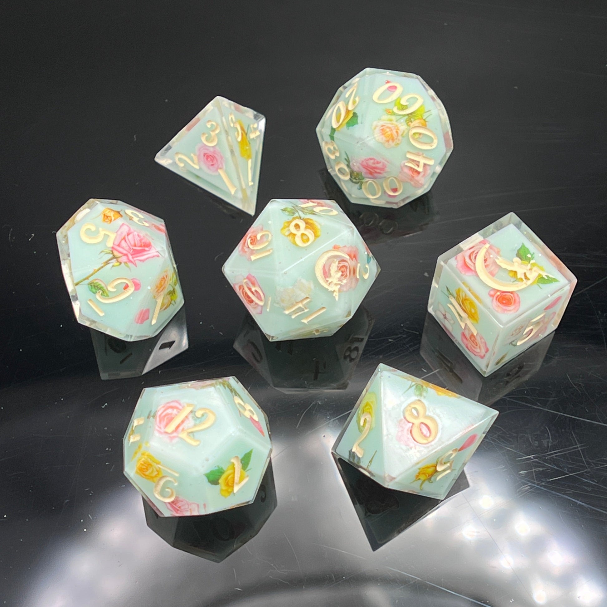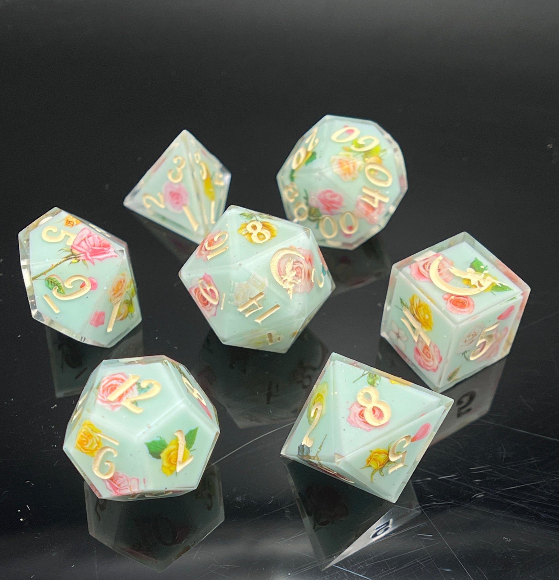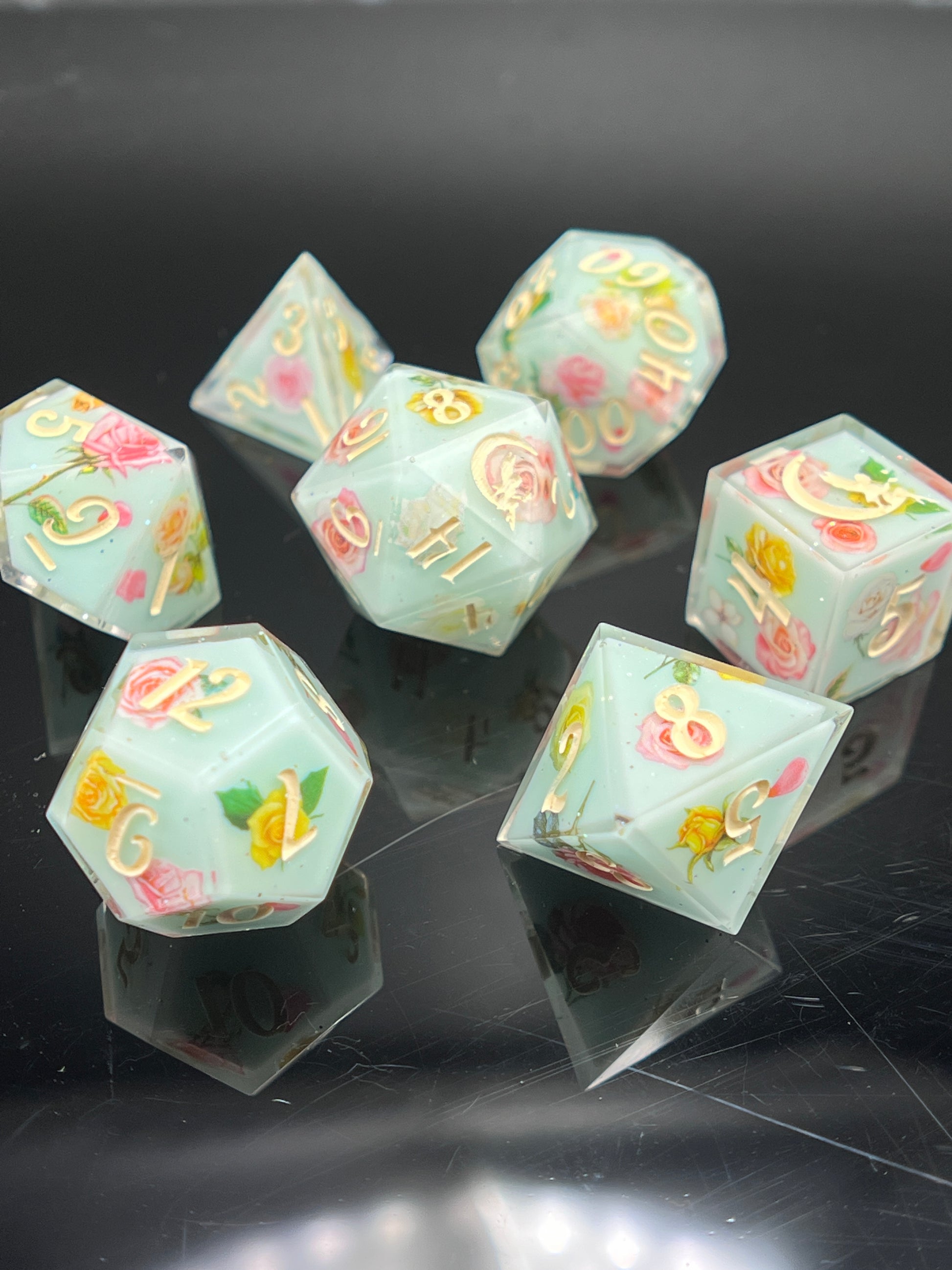 Inspired by tea time, romantic rose gardens, and regency-era gowns, this ladylike dice set features vibrant flowers amid a delicate mint-blue background.