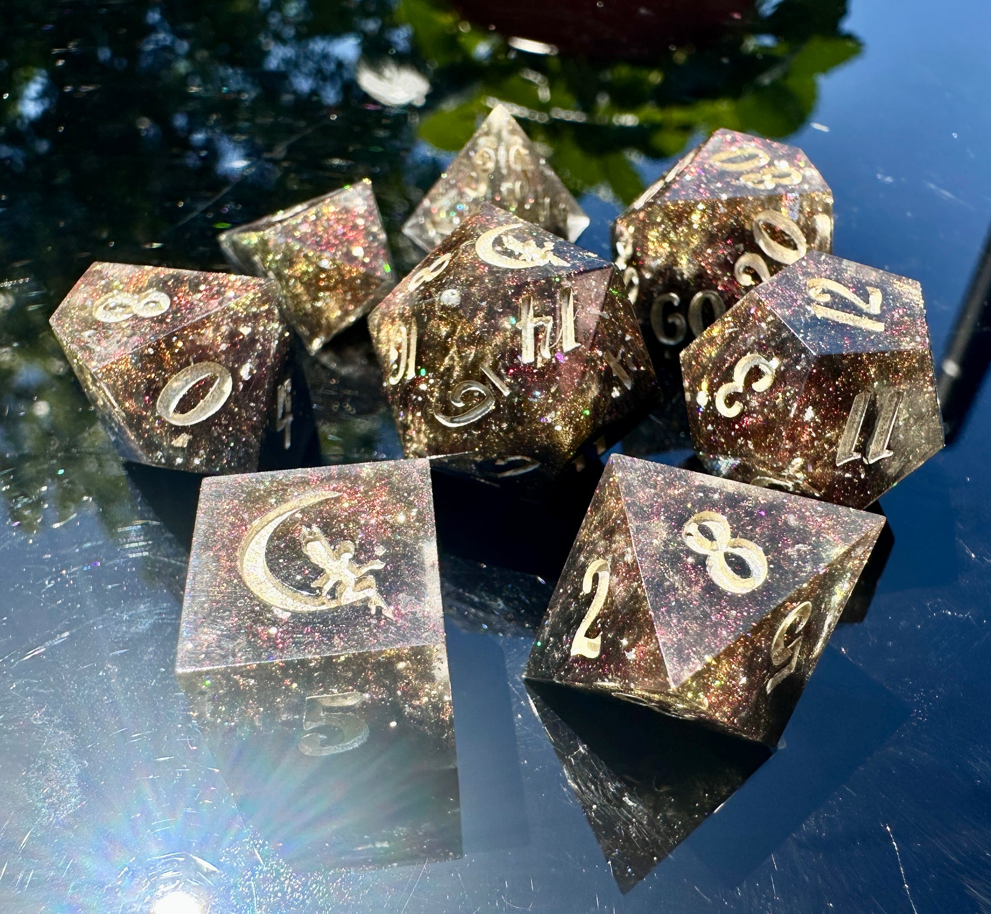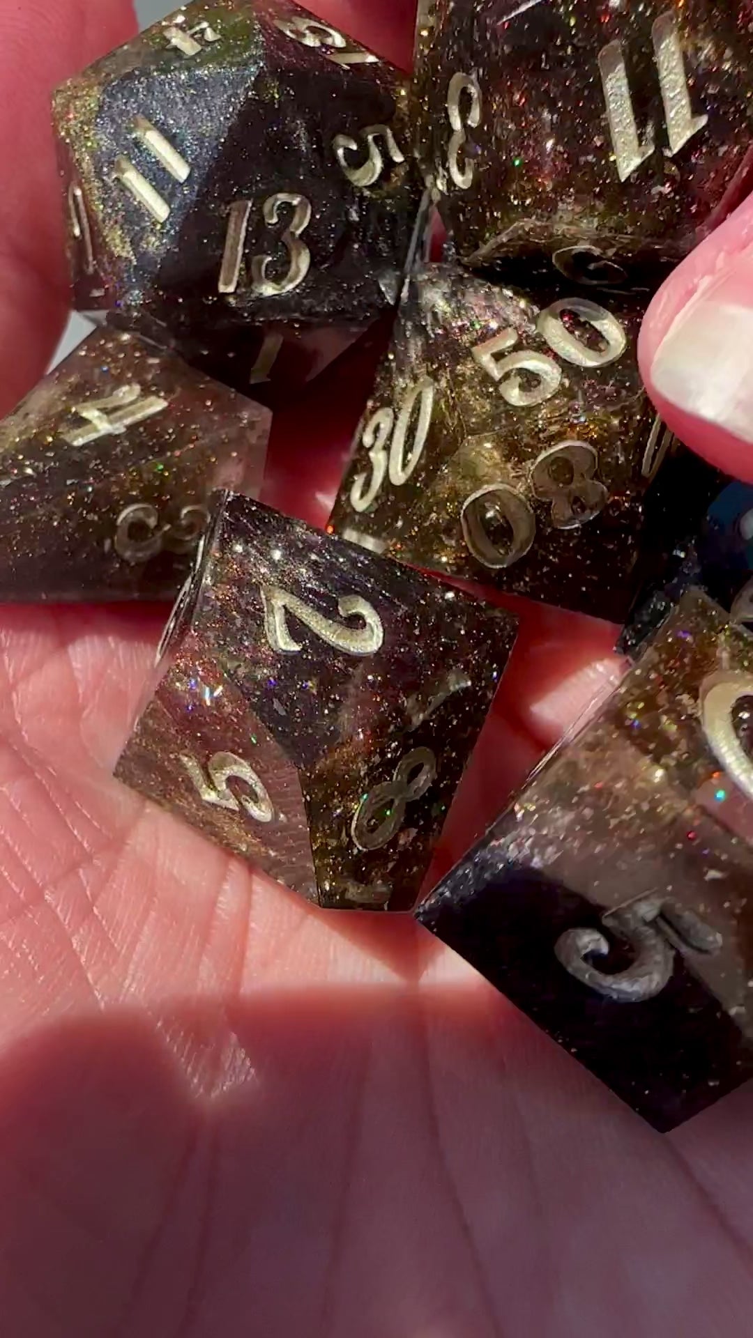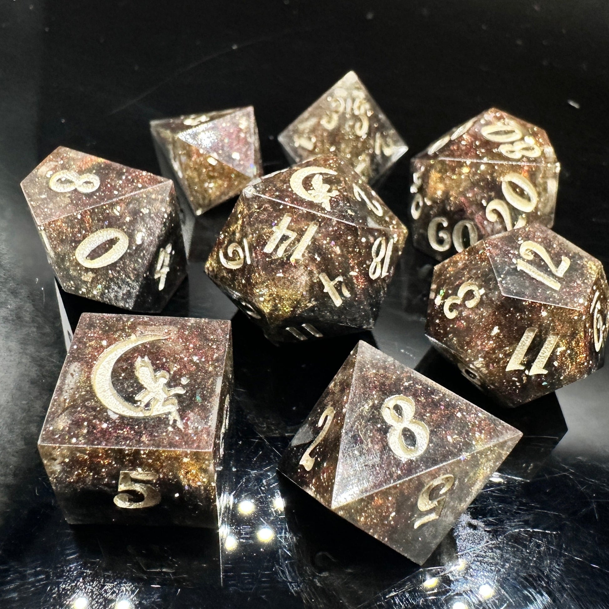 This set features an opaque black base and clear resin with gold flakes and mesmerizing colorshift glitters in silver, gold, and a subtle blood red.