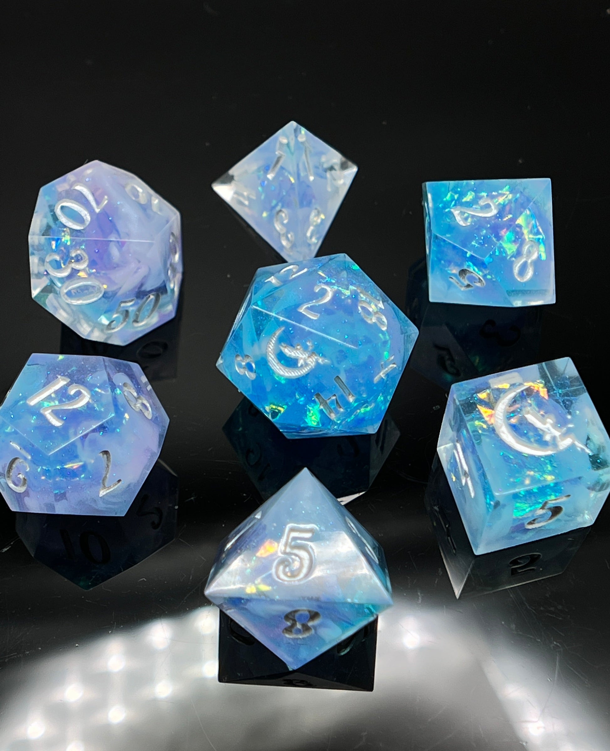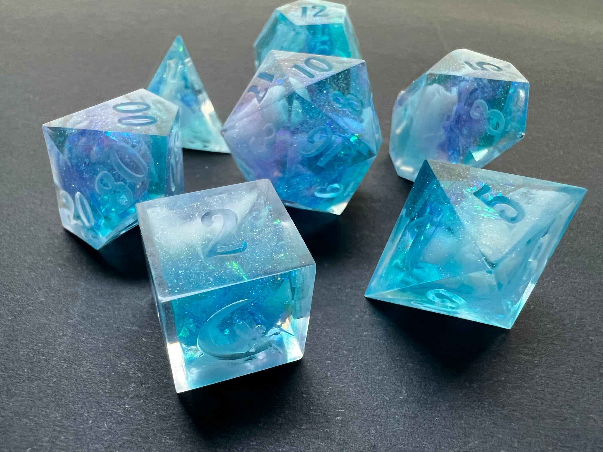 Magical, glittering pastel blue and lavender swirl around fluffy white clouds. Icy. Dreamy. Soft. Shiny. This dice set has a bit of it all. 💙💜