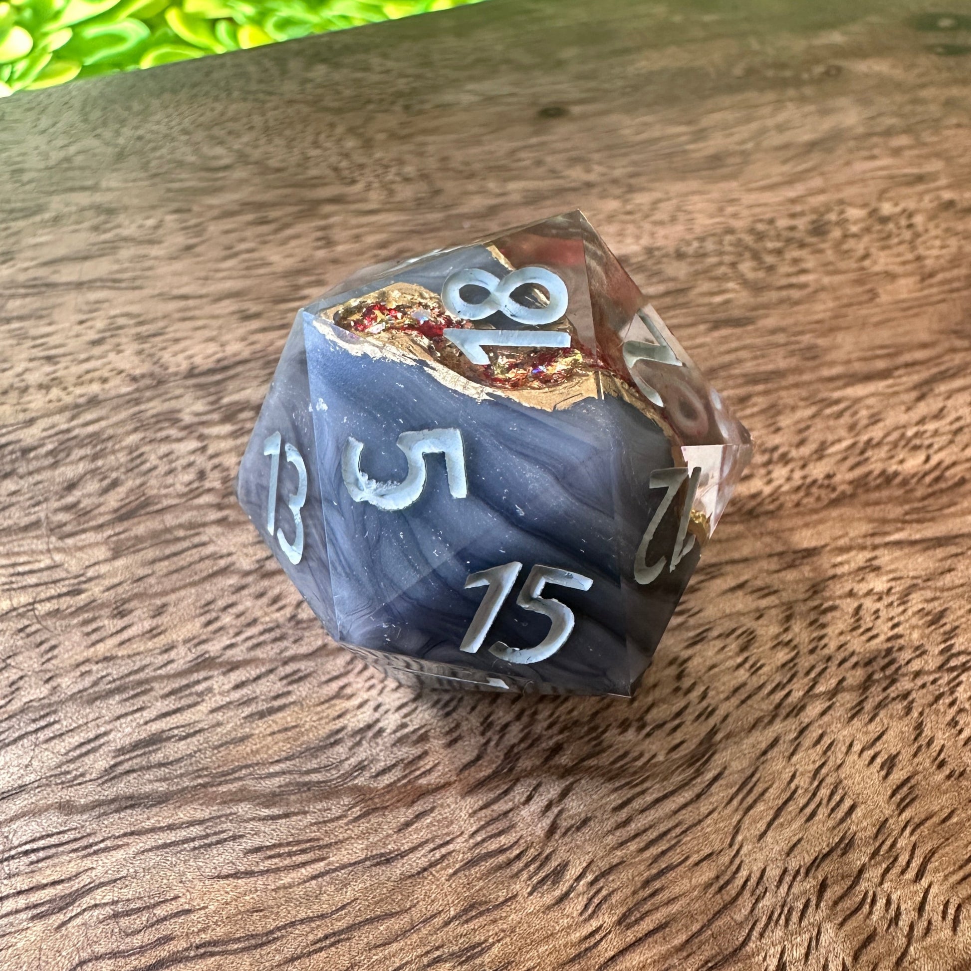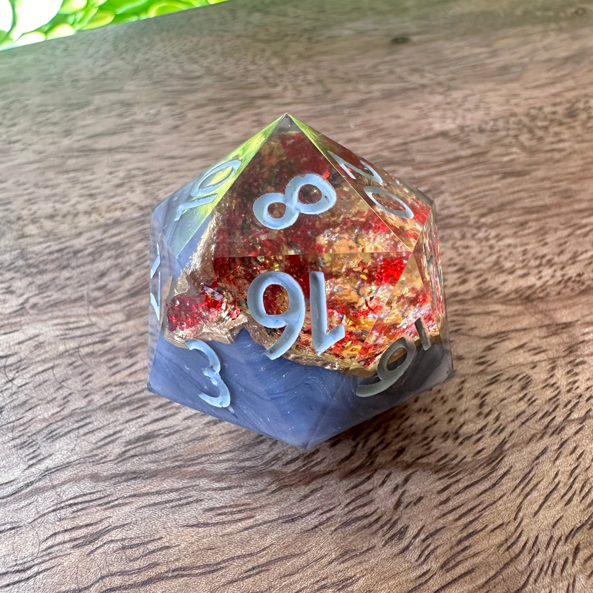 Ignite your tabletop adventures with the Plane of Fire geode D20. Featuring a molten core of fiery red and shimmering gold glitter, this die captures the raw, elemental power of flame. Hand-carved to resemble a geode, the outer layer contrasts beautifully with the blazing interior, creating the illusion of a hidden, burning world.