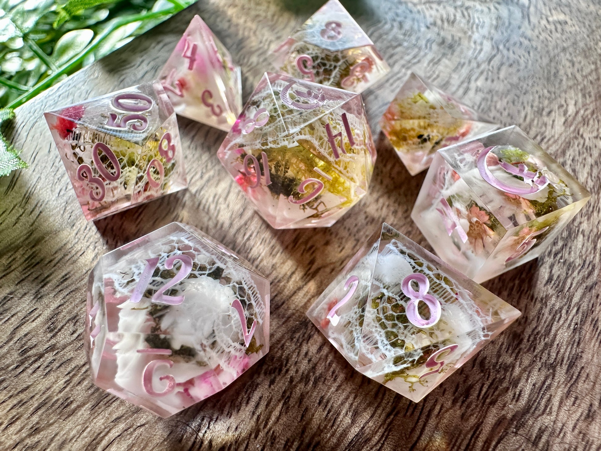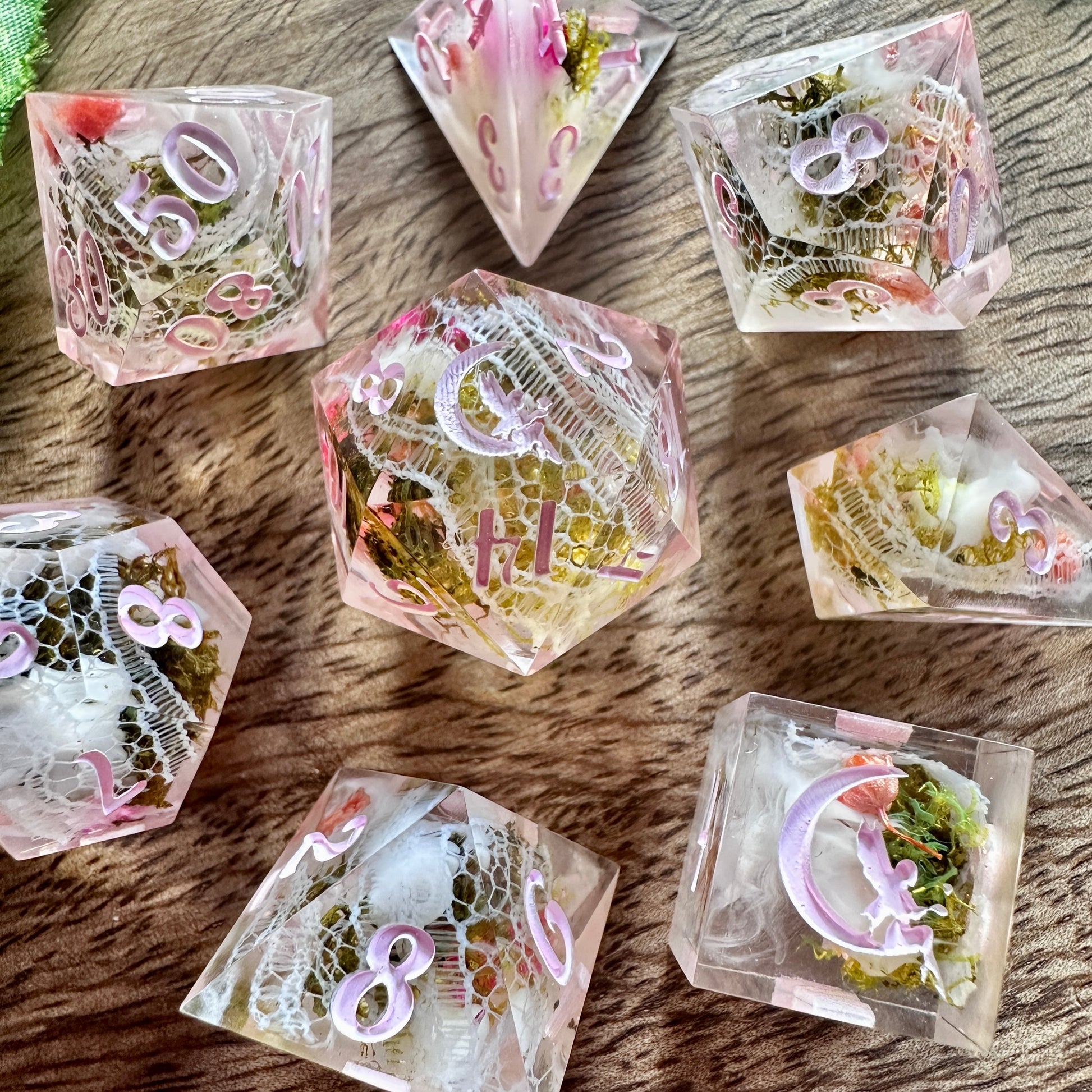 Encased within each die are wisps of delicate white lace and dried pink and peach blossoms, while hints of green moss add a touch of woodland enchantment. These dice evoke the romance of handwritten letters, flower-filled fields, and the quiet charm of a cottage garden.