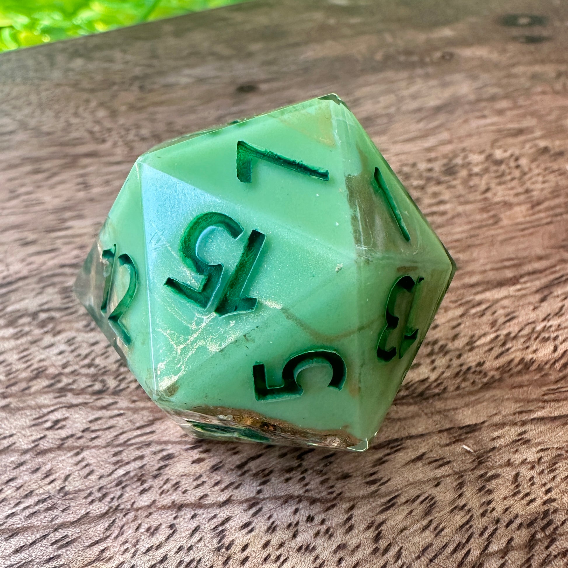 A glistening core of gold hidden inside a lush, mossy green shell. Hand-carved to resemble a geode. Finished with a dark green ink.