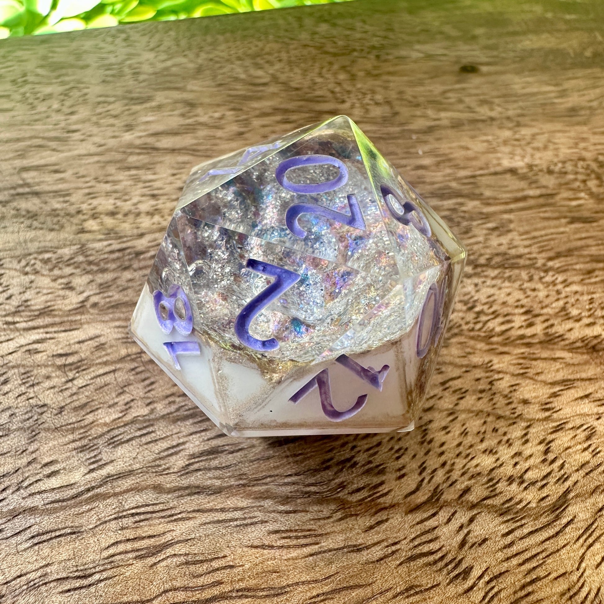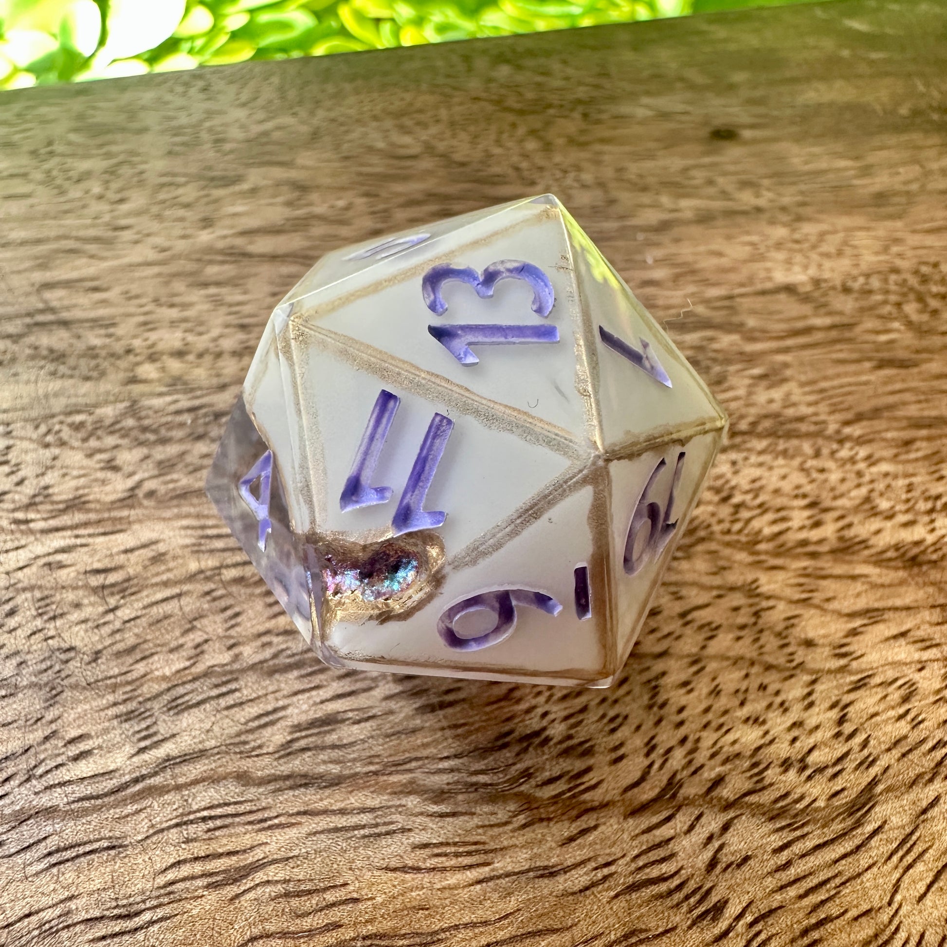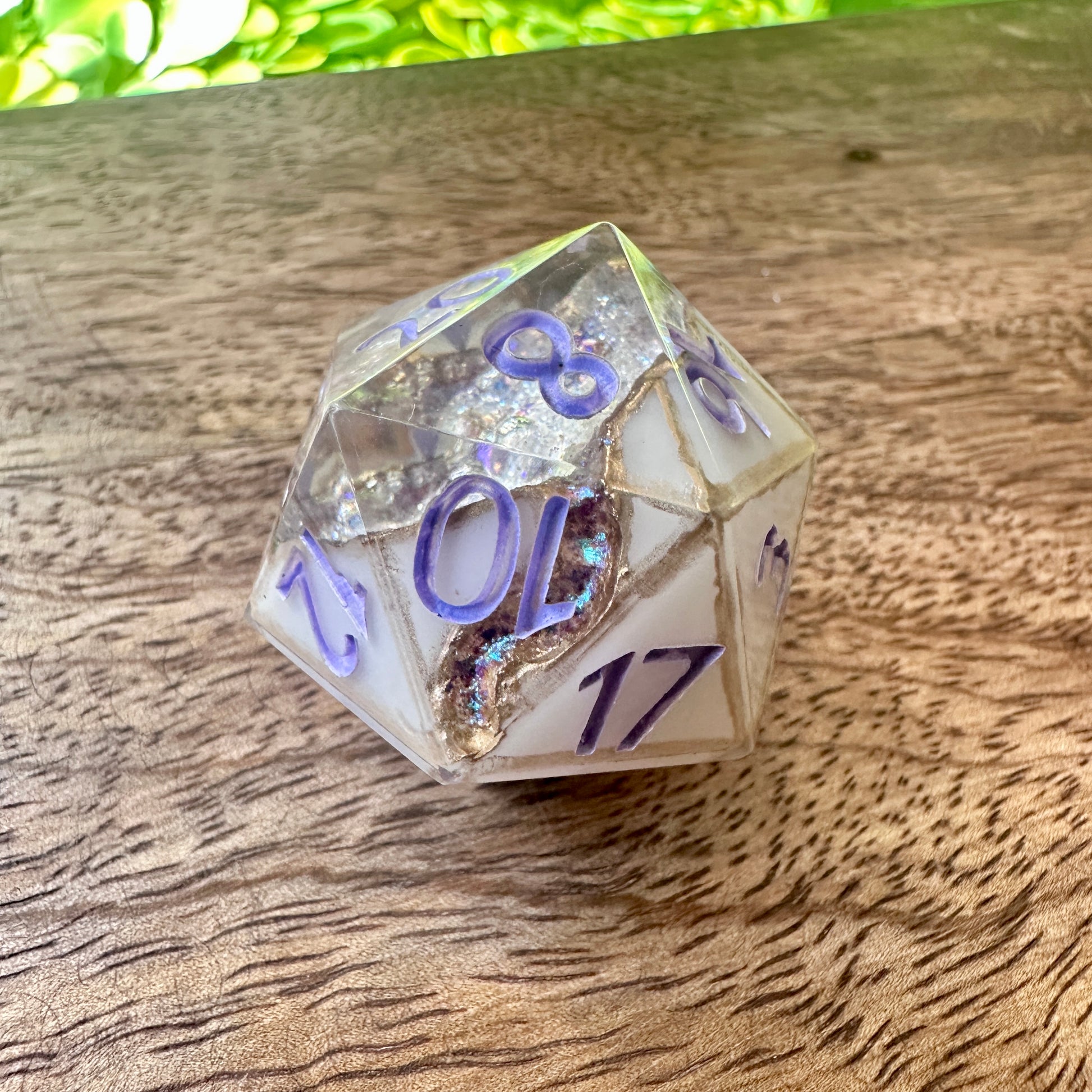 Hand-carved to resemble a geode, this opalescent d20 shimmers with silver, lavender, white, pink, and hints of turquoise. The outer shell is trimmed in gold and it's finished with lavender ink.