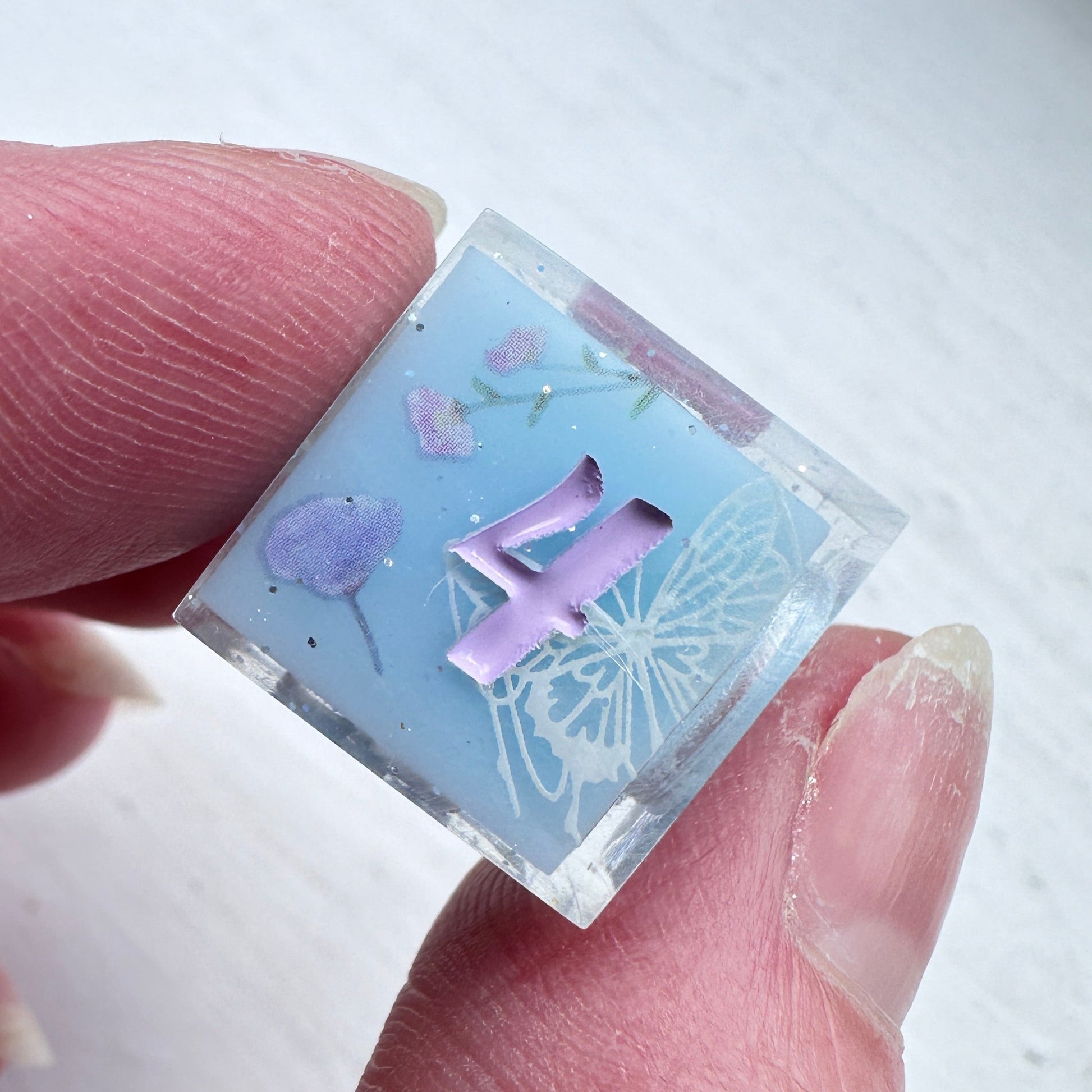 Iridescent butterflies, silver glitter, and an array of pale lavender and pink flowers decorate a base of the softest sky blue.