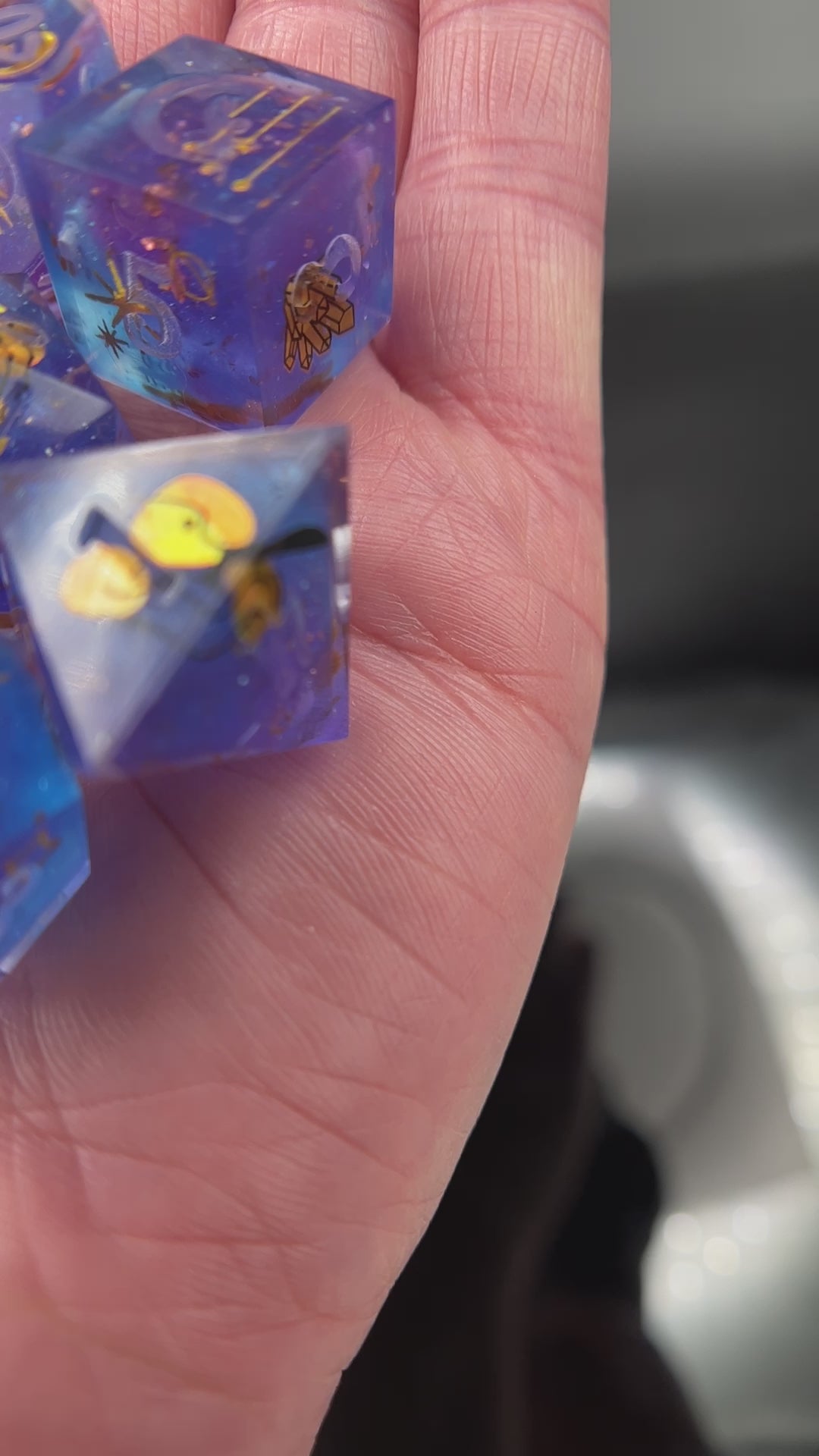 This witchy-vibes set comes in our Fey dice style, meaning it has a whimsical font and the fairy sitting on a crescent moon icon on the D20 and D6.