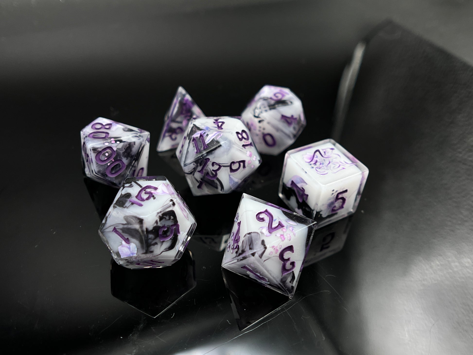 Amid a white and black background lies soft lavender flowers, petals, and vines. This set comes hand-painted in a deep purple.